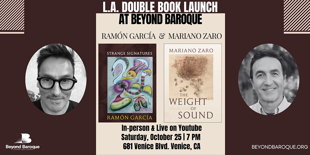 Beyond Baroque presents an evening featuring Ramón García and Mariano Zaro as they present new books published by Walton Well Press. A neo-baroque, lyrical treatise on encountering the Other, García's poems in Strange Signatures reverse the colonial gaze and transform it into scenes of conflicted recognition. Zaro’s The Weight of Sound features language rich in texture and syntax, allowing the reader to feel every verse on the page.