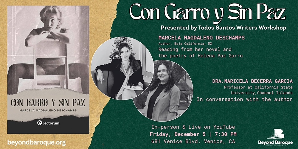 Beyond Baroque and Todos Santos Writers Workshop presents Con Garro y Sin Paz. Author Marcela Magdaleno Deschamps—a writer, playwright, poet, and chronicler—deeply engaged with the life and legacy of Helena Paz Garro and her renowned parents, Elena Garro and Octavio Paz. The author will read from her novel accompanied with photographs and letters chronicling the memories of Paz Garro during her final days at her home in Cuernavaca, Mexico. She will be joined in conversation with Dra. Maricela Becerra García.