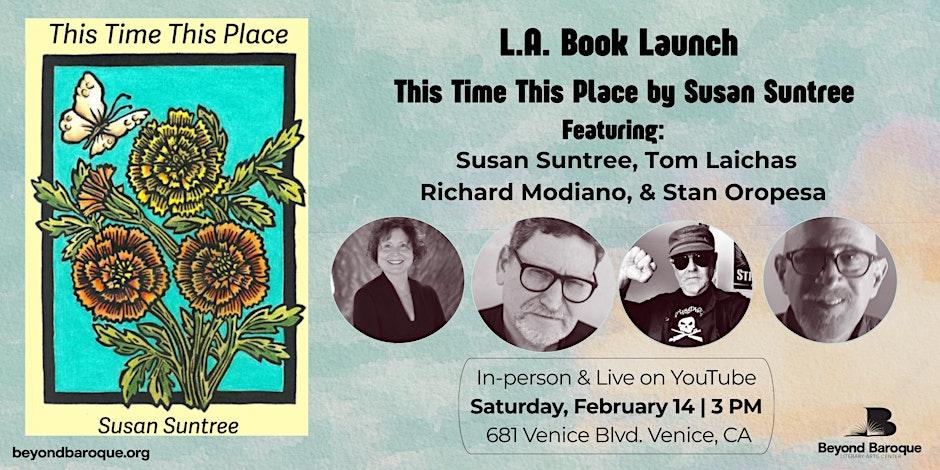 An evening of poetry in celebration of Susan Suntree’s poetry collection This Time This Place. Join us for a celebratory reading featuring Susan Suntree alongside poets Tom Laichas, Richard Modiano, and Stan Oropesa. Both meditative and urgently present, This Time This Place offers poems as contemplations of our current moment—works that pause, listen, and open outward.