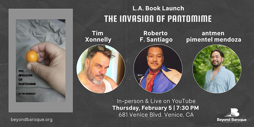 Join us for an evening in the Wanda Coleman Theater celebrating the release of The Invasion of Pantomime, a book by Tim Xonelly composed of themes such as dream imagery and queer pride. Featured poets are writer and educator, antmen pimentel mendoza and therapist, poet and performer, Roberto F. Santiago. Reception and book signings to follow.