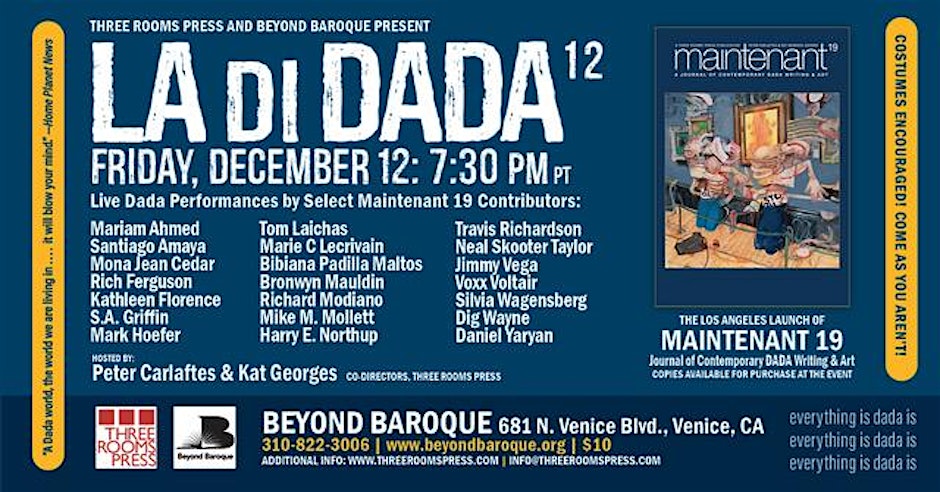 An evening of provocative, exuberant, eclectic performance and poetry is slated to hit the stage as Three Rooms Press and Beyond Baroque present the Ninth Annual ¡LA DI DADA! Salon: a wild ride of contemporary DADA performance and poetry by leading LA-area maverick artists. The event includes the West Coast launch of the internationally-renowned MAINTENANT 19: Journal of Contemporary Dada Writing and Art (2023, Three Rooms Press), which features more than 230 visual and literary works by artists and writers from six continents. Costumes encouraged. Come as you aren’t!