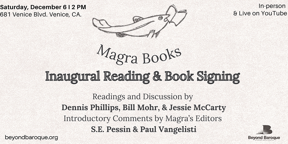 With chapbooks by notable American and European poets, from 2016 to 2025, Magra Books embarks on a new course of independent publishing. The debut at Beyond Baroque features readings and discussion by Dennis Phillips, Bill Mohr, and Jessie McCarty, along with introductory remarks by Magra editors S. E. Pessin and Paul Vangelisti. Books will be available for signing by the authors following the readings in The Wanda Coleman Theater.