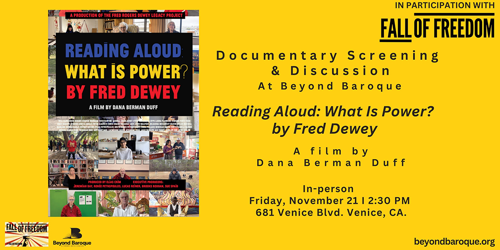 Join us for a screening of Reading Aloud: What Is Power? by Fred Dewey at Beyond Baroque, followed by a discussion of the making of the film and Fred's ideas about democracy and people's power with filmmaker Dana Berman Duff and Renée Petropolous, along with participants from the film: Dorit Cypis, Trinidad Ruiz, Jody Zellen, Dakota Higgins, Brendan Constantine, and democracy activist Wayne Leibman. This program is in participation with Fall of Freedom, a platform empowering the arts community to stand in defiance against authoritarianism.