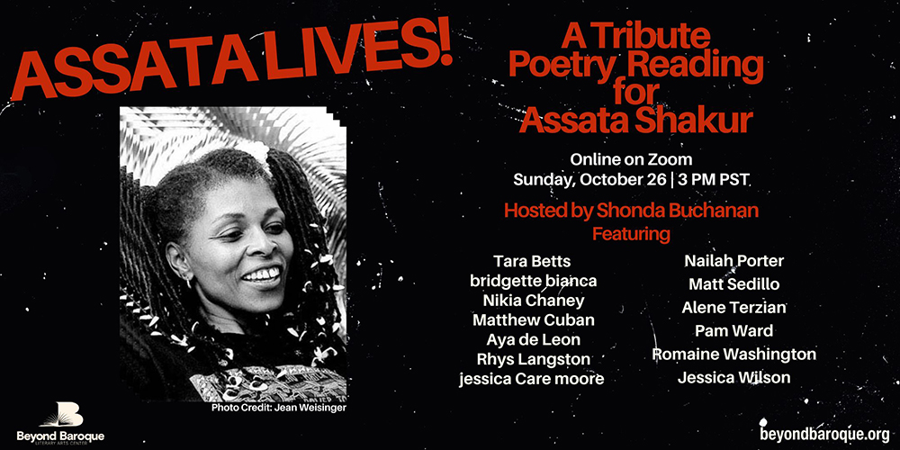 Join us for Assata Lives! A Tribute Poetry Reading for Assata Shakur, an afternoon dedicated to celebrating the life and enduring revolutionary spirit of one of the most powerful figures of the 20th century. This tribute reading gathers a stellar lineup of poets whose work echoes Shakur’s revolutionary vision and power: Tara Betts, Bridgette Bianca, Nikia Chaney, Matthew Cuban, Aya de Leon, Rhys Langston, jessica Care moore, Nailah Porter, Matt Sedillo, Alene Terzian, Pam Ward, Romaine Washington, and Jessica Wilson. Hosted by Shonda Buchanan.