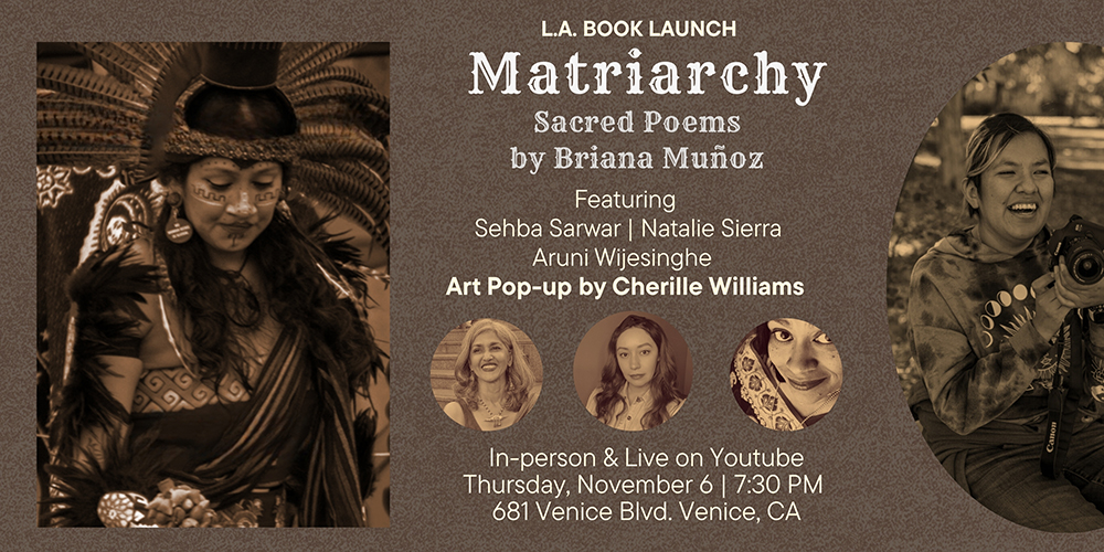 Beyond Baroque presents the book launch of Briana Muñoz’s Matriarchy: Sacred Poems, a collection that draws from ancestral memory to affirm the resilience and sacred power of motherhood and feminine creation. The evening will feature readings by Briana Muñoz, Pomona Poet Laureate Natalie Sierra, Altadena Poet Laureate Sehba Sarwar, and Aruni Wijesinghe, along with a special pop-up art exhibition by Cherille Williams, a Navajo/Diné photographer debuting her work in Los Angeles.