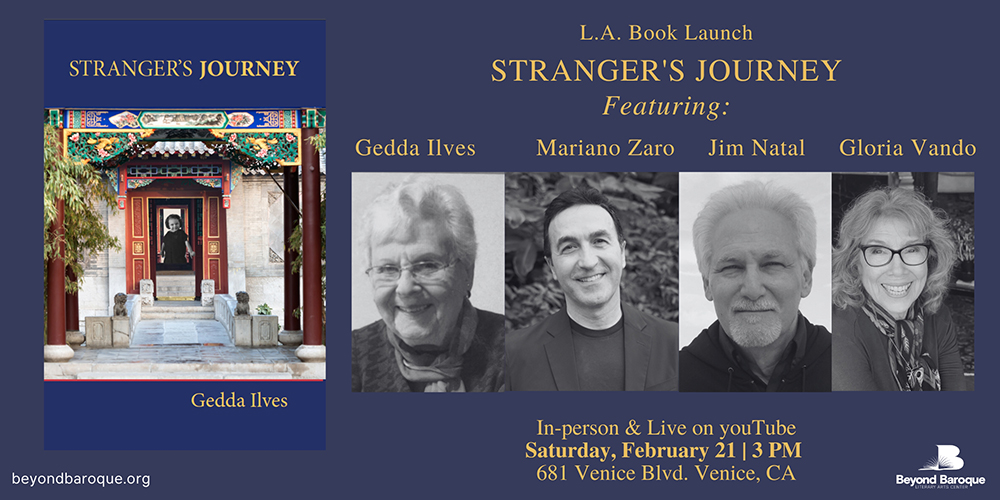 Join us for a poetry reading celebrating the Los Angeles book launch of Stranger’s Journey by Gedda Ilves. The afternoon will feature readings by Gedda Ilves, alongside Mariano Zaro, Jim Natal, and Gloria Vando.
