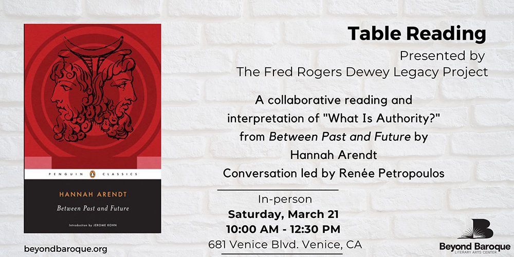 This Table Read will be held from 10:00 AM - 12:30 PM, just this once! Join us for a session of careful, attentive live reading and interpretation of “What is Authority” by Hannah Arendt and The School of Public Life by the late Fred Dewey. Table Reading sessions are hosted at Beyond Baroque, led by Renée Petropoulos and the Fred Rogers Dewey Legacy Project (FRDLP).