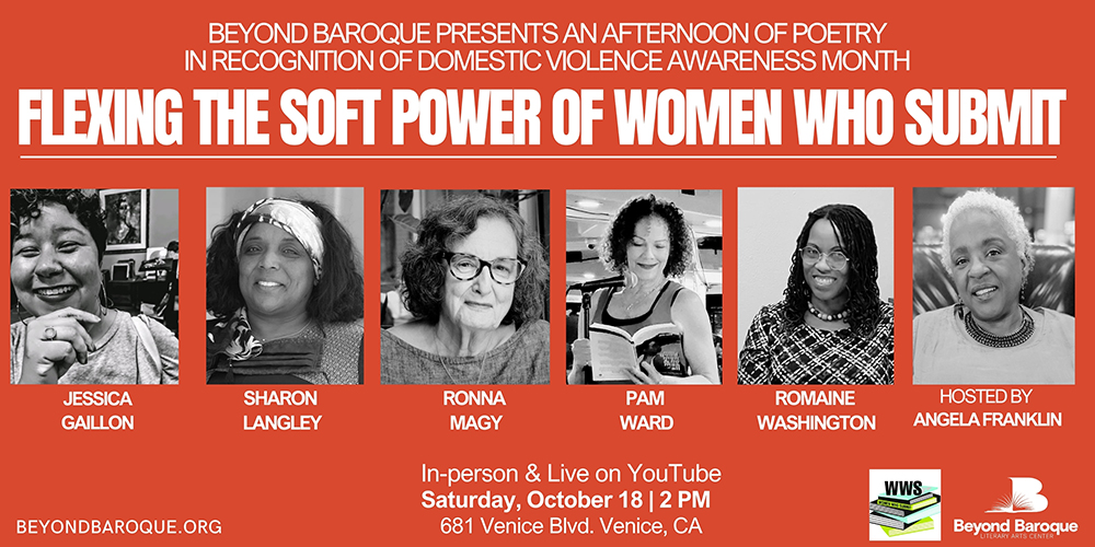 An afternoon of resilience for Domestic Violence Awareness Month. Join poets Angela M. Franklin, Jessica Gallion, Sharon Langley, Ronna Magy, Pam Ward, and Romaine Washington. These poets—four from Women Who Submit, a literary collective championing women and non-binary writers—bring their voices to The Wanda Coleman Theater.