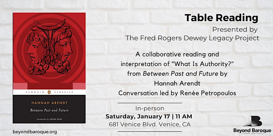 Join us for a session of careful, attentive live reading and interpretation of “What is Authority” by Hannah Arendt and The School of Public Life by the late Fred Dewey. Table Reading sessions are hosted at Beyond Baroque, led by Renée Petropoulos and the Fred Rogers Dewey Legacy Project (FRDLP). There is no need to read anything ahead of time—the text will be passed out at the table. Just come, sit, and read with us. We look forward to your presence.