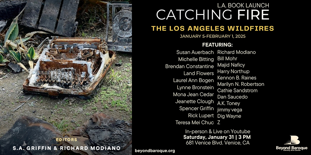 Catching Fire, The Los Angeles Wildfires chronicles the devastating fires that erupted in January, 2025. Join us for an afternoon in community, marked by resilience and healing through the written word. Featuring: Susan Auerbach, Michelle Bitting, Brendan Constantine, Land Flowers, Laurel Ann Bogen, Lynne Bronstein, Mona Jean Cedar, Jeanette Clough, Spencer Griffin, Rick Lupert, Teresa Mei Chuc, Richard Modiano, Bill Mohr, Majid Naficy, Harry Northup, Kennon B. Raines, Marilyn N. Robertson, Cathie Sandstrom, Dan Saucedo, A.K. Toney, jimmy vega, Dig Wayne, & Z.