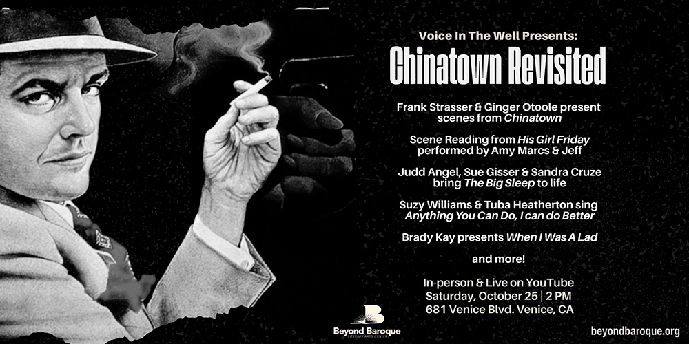 Join us for an afternoon that turns back the hands of time through classic film and song. Experience a lively scene reading from His Girl Friday performed by Amy Marcs and Jeff, followed by Frank Strasser and Ginger O’Toole presenting memorable moments from Chinatown. Judd Angel, Sue Gisser, and Sandra Cruze will bring The Big Sleep to life on stage, while Suzy Williams and Tuba Heatherton perform the playful duet “Anything You Can Do, I Can Do Better and more! Curated and hosted by Eric Vollmer.