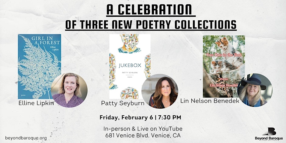 Join three LA poets as they launch their fall 2025 books of poetry: Elline Lipkin with Girl in a Forest (Trio House Press), Lin Nelson Benedek with Two Cats in the Yard, (Kelsay Books), and Patty Seyburn with Jukebox (What Books Press).