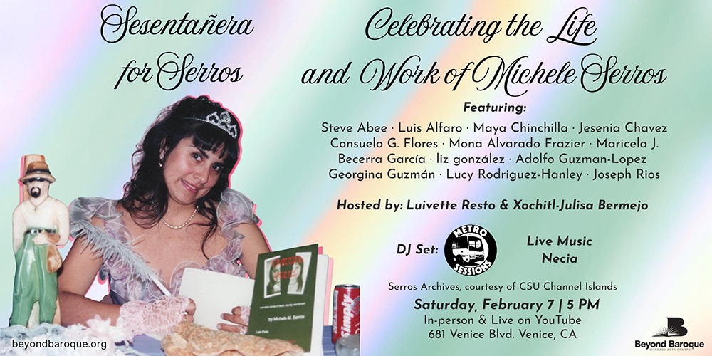 Join us for a celebration of the life and work of Michele Serros, a Gen X poet, performer, rock star role model, and dear friend. We celebrate her 60th birthday in a way she would have loved with poofy dresses, poetry, stories, music, and laughter. The event will feature readers Steve Abee, Luis Alfaro, Maya Chinchilla, Jesenia Chavez, Consuelo G. Flores, Mona Alvarado Frazier, Maricela J. Becerra García, liz gonzález, Adolfo Guzman-Lopez, Georgina Guzman, Lucy Rodriguez-Hanley, and Joseph Rios. The evening will be hosted by Luivette Resto and Xochitl-Julisa Bermejo. DJ Set by Metro Sessions and live music by Necia.