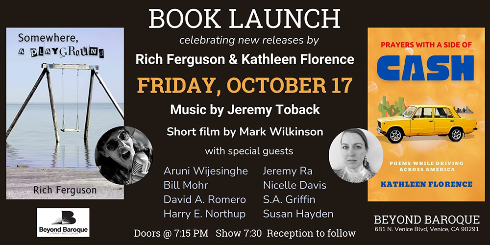 Join Beyond Baroque for a special night of poetry, film and music celebrating the launch of two new poetry collections by Rich Ferguson and Kathleen Florence. Featured alongside are poets Aruni Wijesinghe, Bill Mohr, David A. Romero, Harry E. Northup, Jeremy Ra, Nicelle Davis, S.A. Griffin, and Susan Hayden. Music by Jeremy Toback and a short film by Mark Wilkinson will also be featured as we celebrate the power of words and connection.