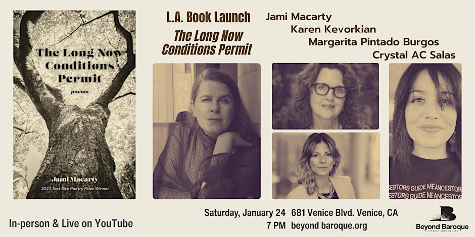 Join us at Beyond Baroque for a celebration with Jami Macarty as she reads from her new collection, The Long Now Conditions Permit. The poet will read alongside Karen Kevorkian, Crystal AC Salas, and Margarita Pintado Burgos. Book signings and reception to follow.